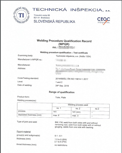 以上为斯洛伐克TI机构出具的WPQR样本